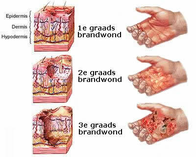 Verbranding: bij verbranding moet je niet alleen denken aan vuur, maar kan ook door heet water, elektriciteit en UV- straling. Hoe groot de schade is kan variëren.